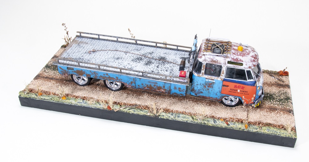 Omer combined Hasegawa and AMT kits to model a custom, three-axle, extended cab Volkswagen flatbed tow truck. His journey began by cutting off the front of a VW Type 2 21-window van and joining it to the rear end for the extended cab. From there, it was rebuilding the chassis, and so on until he had a one-of-a-kind hauler. Saving himself a little worry, he turned to the aftermarket for wheels, tires, and brakes.