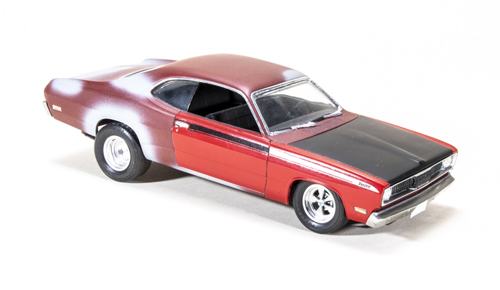 Michael Newport’s 1971 Plymouth Duster shows a car whose owner keeps finding better parts while in the midst of a rebuild. Coming at the project with an AMT kit, Michael dropped a Slant Six under the hood and installed a bench seat inside. He painted with Rust-Oleum Red and Gray primers, Gloss Red, and Black. Rust effects in the engine bay and under the car add authenticity.