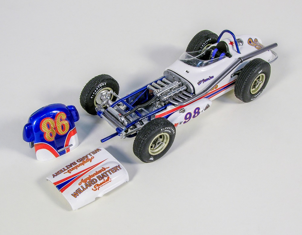 Nate Bemis said his AMT 1/24 scale Parnelli Jones Watson Roadster ‘63 Indy 500 Winner was built box stock aside from a clear Lexan screen and an Indycals decal set. The model was finished with Tamiya paints.