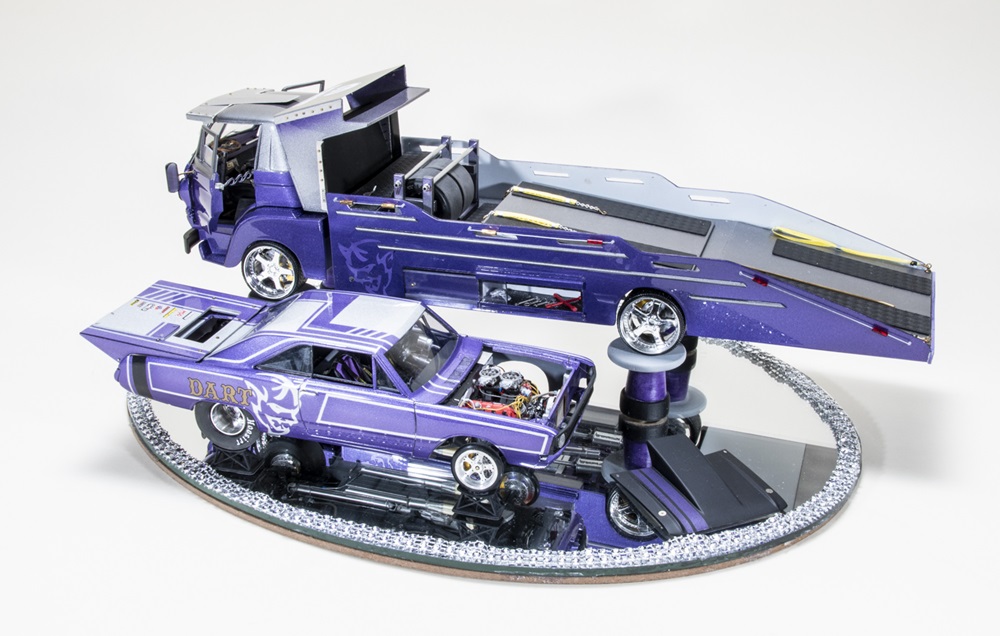Mike Alvarez built Lindberg and Revell 1/25 scale kits to realize his L-700 drag hauler and Demon Dart. He scratchbuilt the truck bed and dressed up both vehicles with plenty of aftermarket accouterments from Detail Master, MCG, Pro Tech, and Mr. Model. Mike painted the drag car and transporter Dodge Plum Crazy over silver masked for custom patterns.
