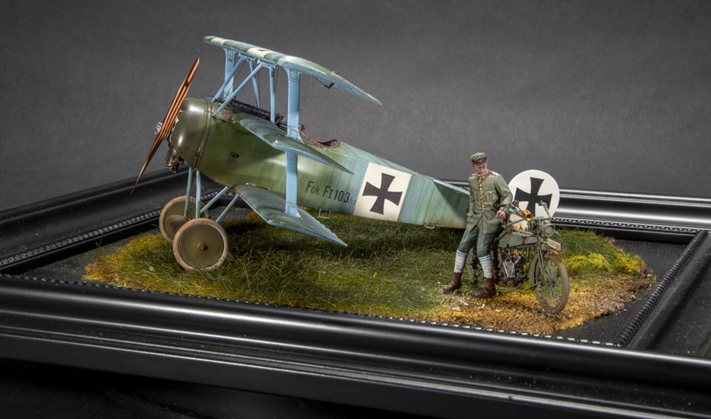 Aviattic Fokker F.I 103/17 decals and cowl, Aeroclub bezels, HGW Models seat belts, EZ Line rigging, and more modify Dave’s Meng 1/32 scale Fokker Dr.I triplane to make it Werner Voss’ prototype. Dave employed pre- and post-shading, acrylics, lacquers, and artist-oil washes to finish the model and placed it on a picture frame on top of a lazy susan.