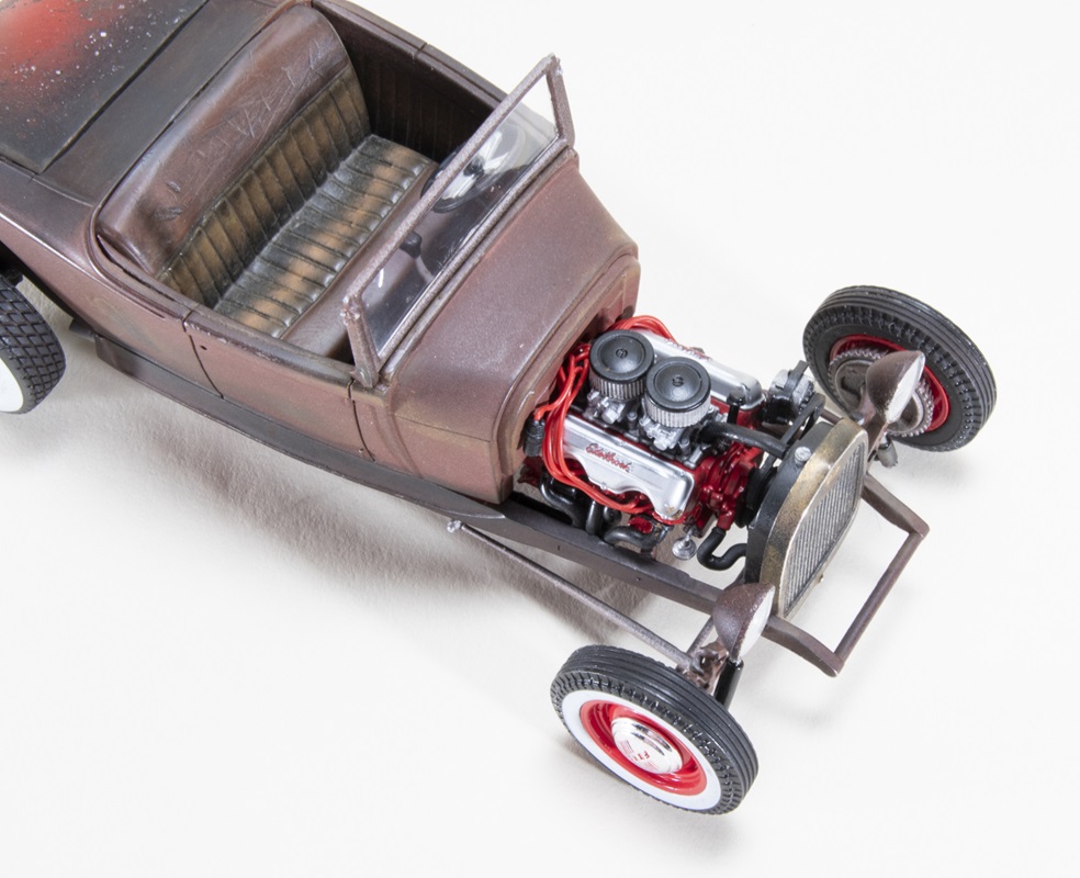 This Revell 1/25 scale 1929 Ford roadster depicts a barn find someone discovered, updated, and now drives for fun, according to Dean. He stuffed a 409 Weekend Wrencher from VGG Resins behind the radiator, a four-speed transmission behind it, and a banjo rear end. He weathered the heck out of the roadster with just about everything, including Rustall, pastels, and pigments over Testors enamels and Tamiya acrylics.