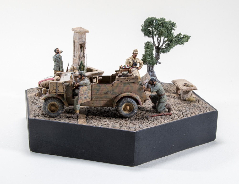 “Sbriganti!” depicts Italian soldiers repairing a broken down German-made Kubelwagen in Sicily, 1943. A Meng 1/35 scale kit served as a starting point. James added parts from a Tamiya Maintenance Crew kit, added tow hooks and a rope, and draped an Italian flag over the spare tire and wheel on the bonnet. He carved the base’s cobblestones in AK Interactive foam, sculpted the tree and bench, and the water from the fountain was made with fishing line and artist gel.