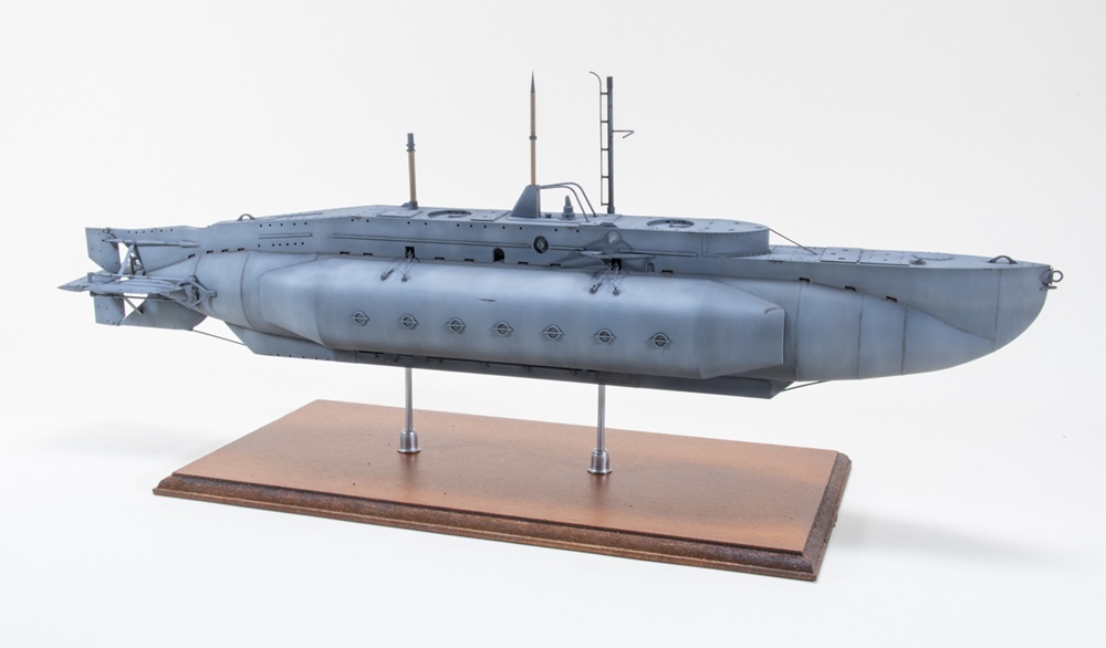 X-Craft midget submarines were first deployed by the British Royal Navy in 1943 and successfully laid charges beneath the German battleship Tirpitz. Sergio built a Merit/I Love Kit 1/35 scale kit and added an Eduard photo-etched set along with a scratchbuilt propeller. Tamiya and Mr. Color lacquers color the hull, with final touches from LifeColor acrylics and Abteilung 502 oil paints.