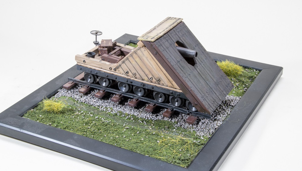 Max, 13, built a Lee-Brooke railway gun from Vargas Scale Models. To complete the 1/35 scale model, he scratchbuilt an ammo box and made a base from foam, modeling mud, and model railroad grass. Max painted the railway gun with Ammo and Tamiya acrylics and a paintbrush, only turning to an airbrush when he needed to spray gloss or flat varnish.