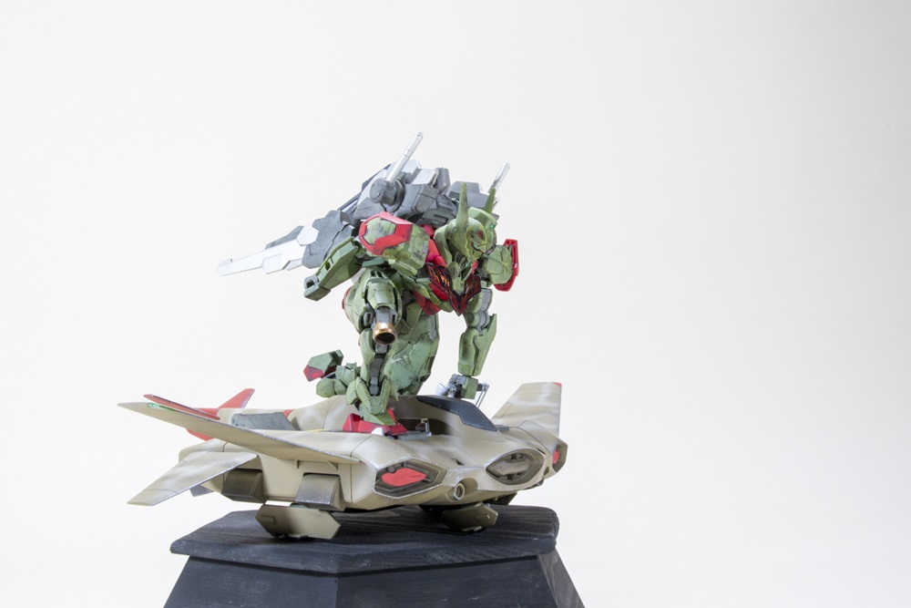 Bruce’s Bandai 1/144 scale Gundam Lfrith rides a Tickbalang painted in a freehand camo scheme with Tamiya and Vallejo acrylics. He weathered both the mech and its flight system with artist-oil washes.