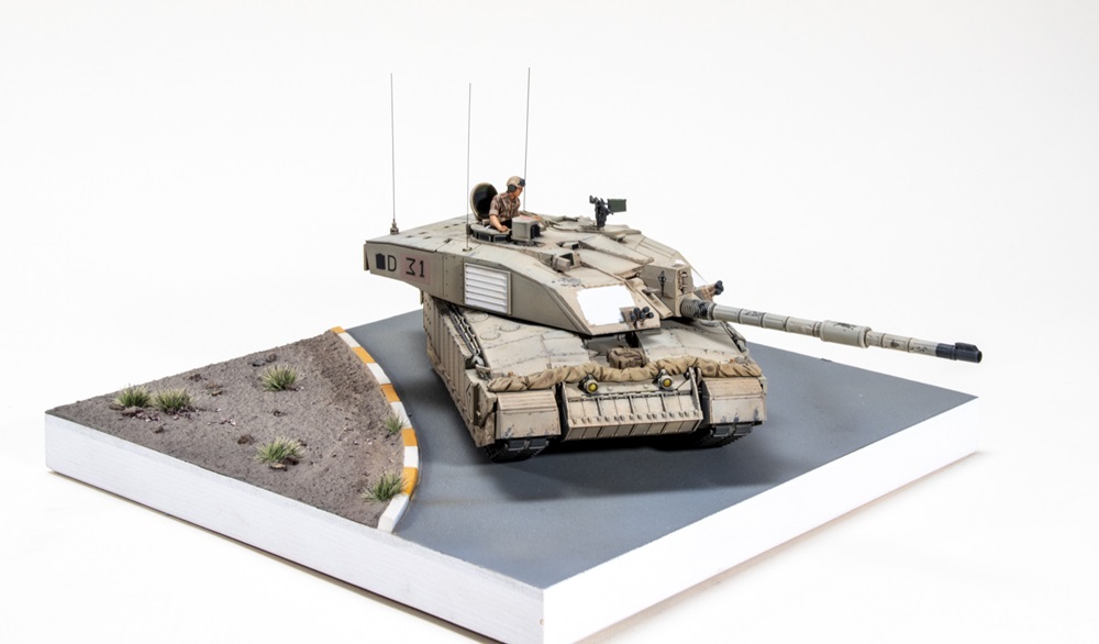 Andrew used Star decals on his Tamiya 1/48 scale Challenger 2 MBT to depict the Queen’s Royal Hussars in Al-Amarah, Iraq, 2004. The tarp up front is from Red Zebra Models. Andrew used the hairspray method to chip the tank’s paint and made a base from scratch, creating an Iraqi street.