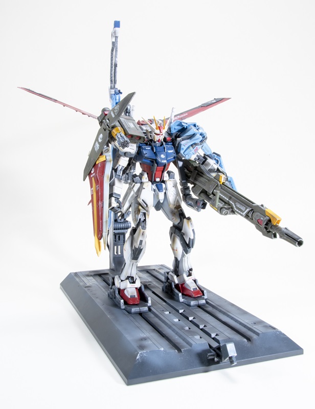 Patrick’s model shows the Mobile Suit Gundam SEED Perfect Strike Gundam ready for launch. He built the Bandai MG 1/100 scale model and included base mostly from the box, adding aftermarket decals for better-looking markings. Vallejo Mech Air and Model Air and Tamiya acrylics handled the colorful paint job. Patrick pre-shaded panels for better contrast and upped the ante with Tamiya Weathering Master pigments and AK Interactive Weathering Pencils.