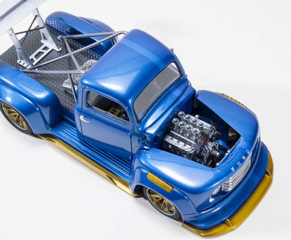 Hector Guadalupe overhauled a Revell 1/25 scale 1950 Ford pickup with an MCV Products 3D-printed wide-body kit, Boss 429 Mustang engine, cooling fans, steering wheel, and mufflers for a unique “Formula 1” pickup. He airbrushed a variety of colors from Gravity, Tamiya, and Revell to get an out-of-this-world blue finish with a ghost strip down the driver’s side.