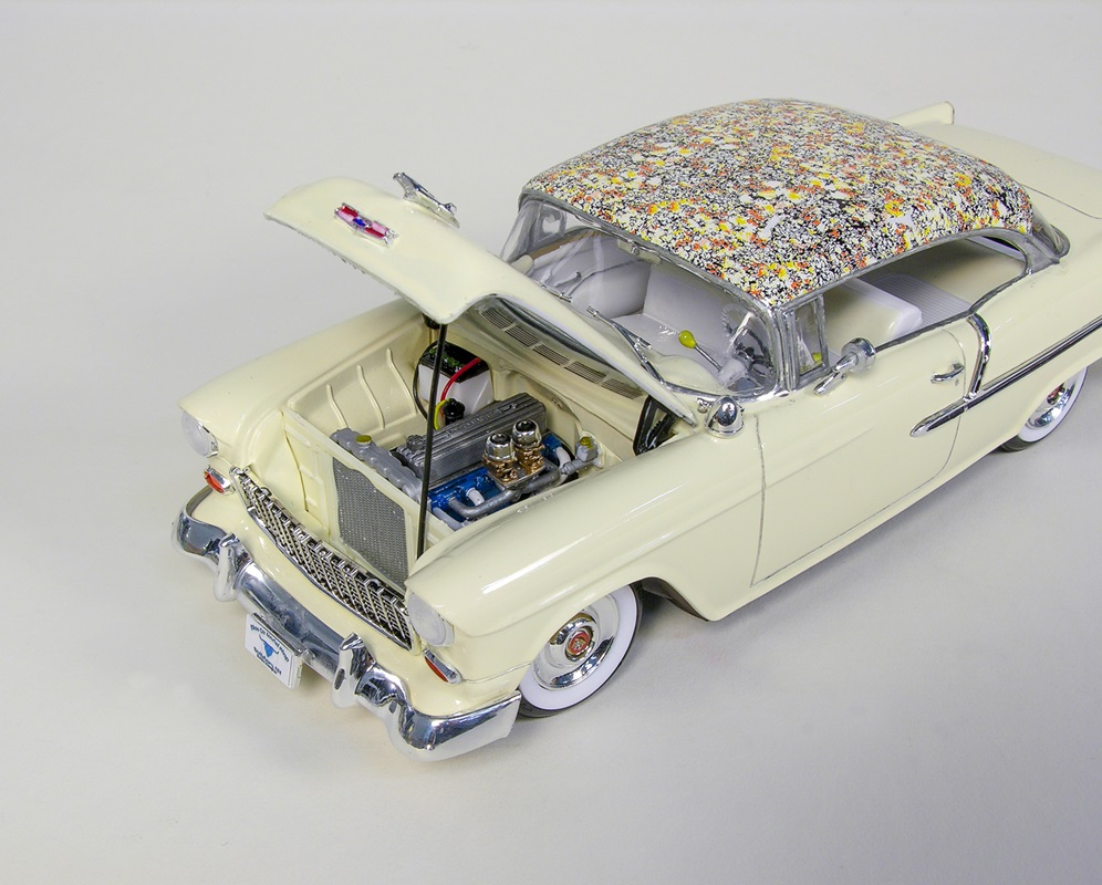 An Iceman Collections 3D-printed Chevy 235 engine and VCG Bonaire Swamp Cooler air-conditioning unit upgrade Jason Hanscom’s Revell 1/25 scale ‘55 Chevy Bel Air. A Slixx Decals Mopar Mod top over Tamiya paint creates a unique, custom look. You got Mopar on my Chevy!