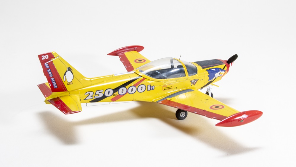 The SIAI-Marchetti SF.260M is a militarized version of the Italian-made two-seat aircraft. Mike built a Special Hobby 1/48 scale kit of the plane and decorated it for service as a trainer for the Belgian air force. Tamiya primer served a the base for MRP and Tamiya lacquers. The scheme was achieved with “lots of masking.”