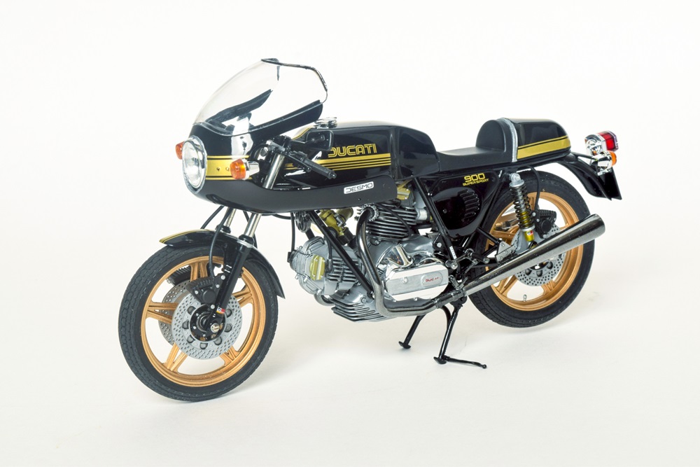 Jon Eby, a fan of motorcycles and “cool bikes,” recreated this Tamiya 1/12 scale Ducati 900 SS. He finished it in MCW Black lacquer and applied Alclad II Chrome to all of the factory chrome parts.