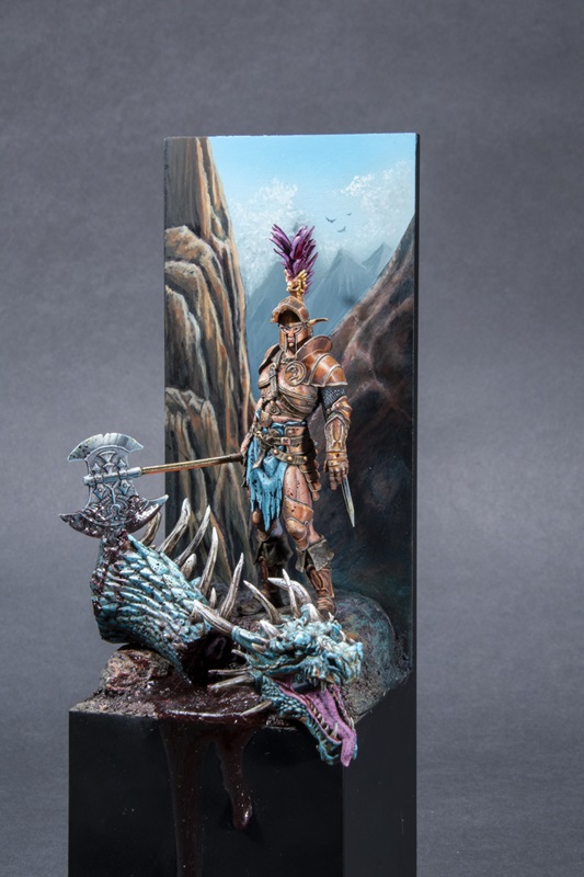 Jerry sculpted a base from Milliput and added a backdrop to a Kimera 75mm Sigurth and a 3D-printed dragon. He brush-painted with Vallejo and AK Interactive acrylics, and made extensive use of ink washes.