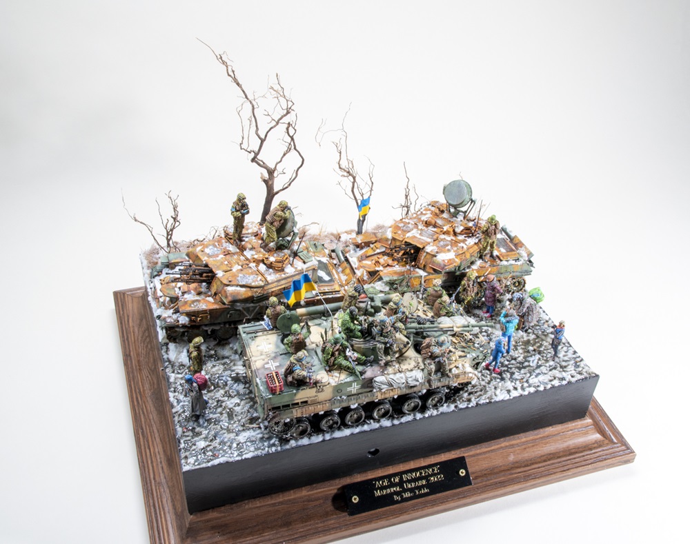 Mike’s diorama, Age of Innocence, depicts Ukrainian troops on a captured Russian tank waving at a photographer and refugees. He used 1/35 scale Dragon and Trumpeter Shika AA and BMP3-E tanks and added LEDs from Evans Designs to illuminate their interiors. Painting, Mike went with Vallejo acrylics, Tamiya enamels, and artist oils, and worked both with an airbrush and paintbrushes.