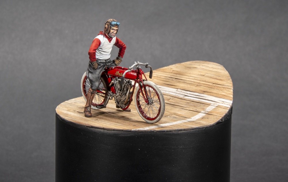 Declan scratchbuilt a base from styrene strip and finished it with acrylic paints and artist oils for his Cix Models 1/35 scale 1913 Indian board track racer and pilot. He painted the figure with Tamiya lacquers, Vallejo acrylics, and weathered with Winsor & Newton artist oils to make a figure and bike ready for a race in Milwaukee, Wis.