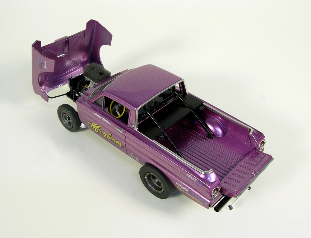 To replicate South East Gasser Association member Colby Welch’s 2022 B/Gas Champion’s gasser, Jim Rondos finished a Trumpeter 1/25 scale 1965 Ford Falcon Ranchero with a Tamco base coat and 2K clear sent by Colby Welch himself. Jim made a flip nose, hinged tailgate, and added STS custom decals.
