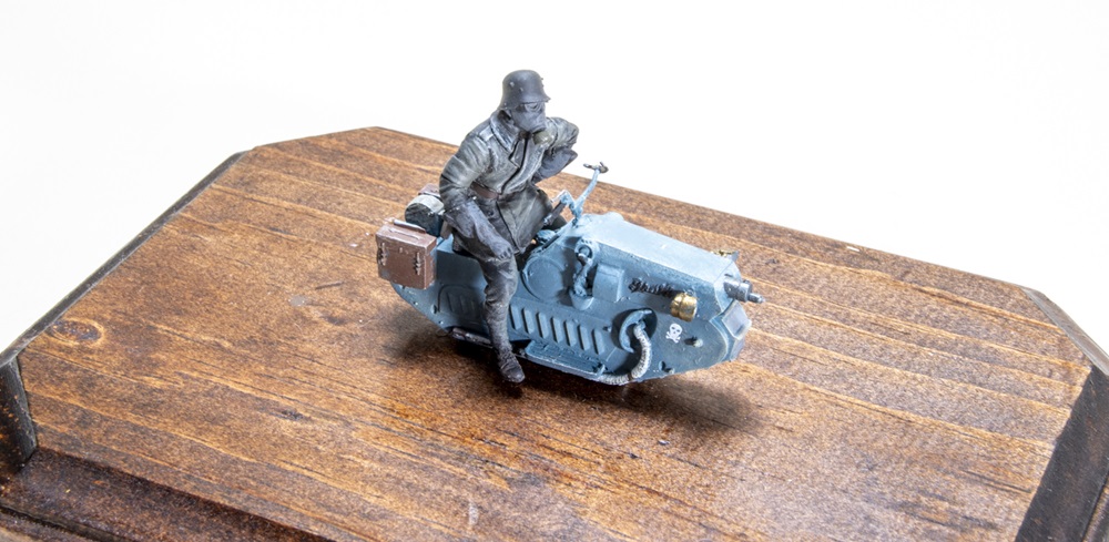 The Grohl company developed the kettenkrad tracked motorcycle used by Germany for recon and towing zeppelins and by the British in Palestine. Larry brush-painted a 1/35 scale resin model of a 1910 kettenkrad and rider with Vallejo colors and added some dirt and wear with washes and pigments.