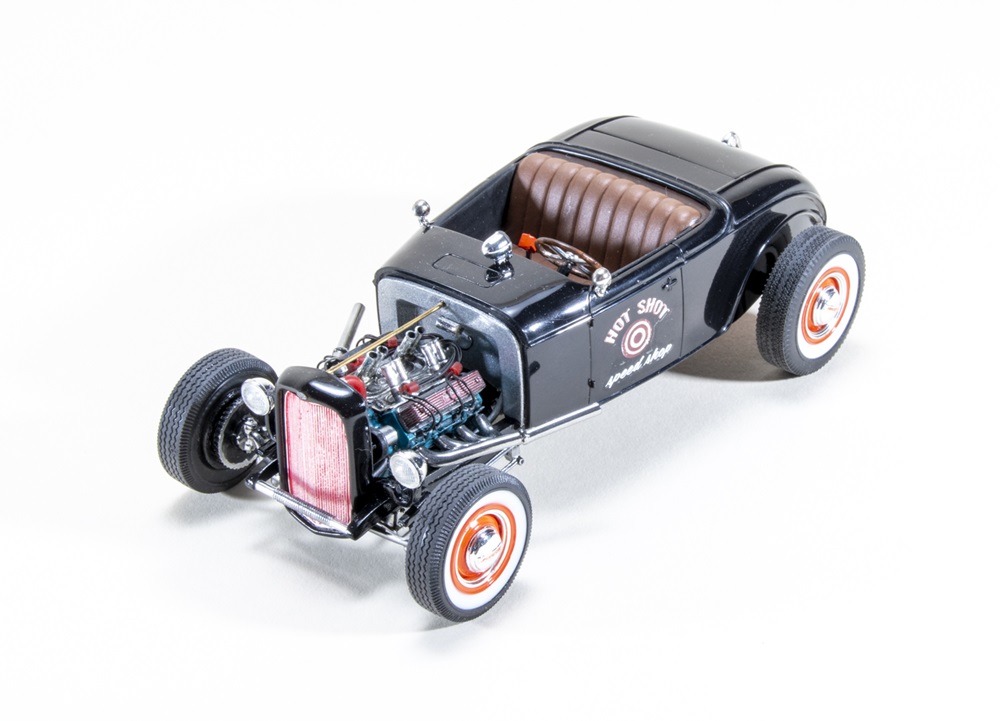 Vic Rood’s old-school 1932 Ford roadster is all set for racing on the Bonneville Salt Flats. He replaced the engine in an AMT 1/25 scale kit with a fuel-injected Olds 425, wired it, and scratchbuilt headers. There’s no paint on the body of Vic’s Ford; he just buffed the plastic. Where he did paint, Vic airbrushed the colors and slightly weathered the engine.