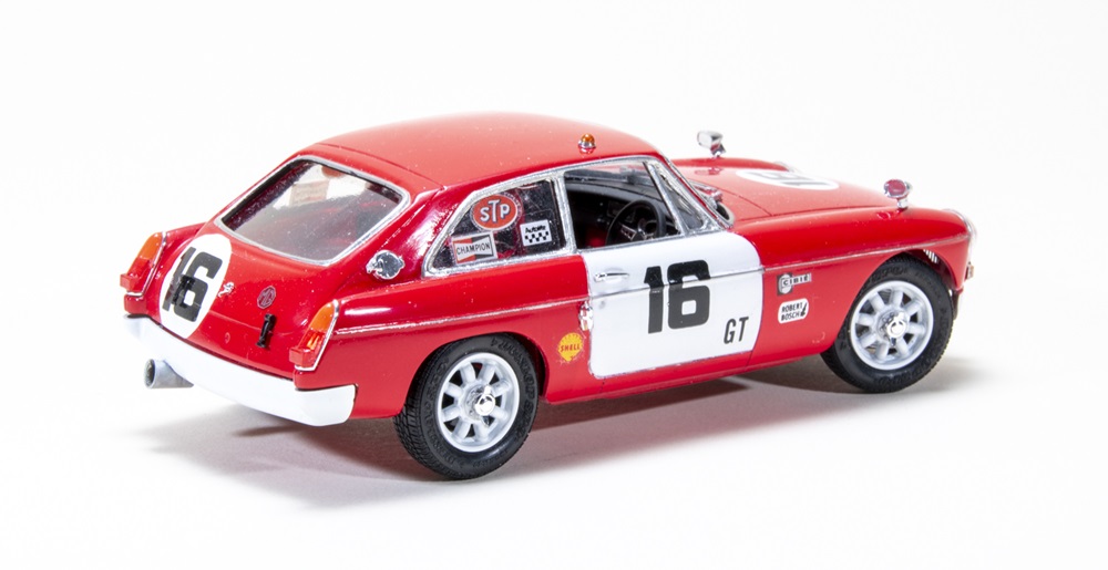 To replicate a 1967 four-cylinder “works” MGB GT built for Sebring and Targo Florio, Stew used an Aoshima 1/24 scale Mazda roadster, added a roof from a damaged resin casting, lowered the stance by 1 1/2 scale inches, and added a fuel tank to the back end. The color scheme is Tamiya Italian Red and Pure White under Testors Wet Look Clear with decals from Fred Cady and the kit.