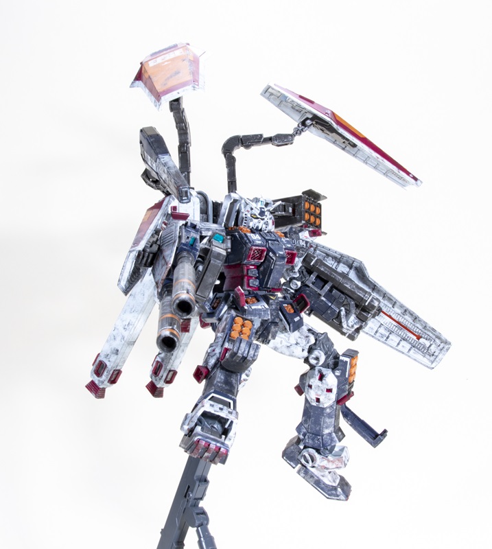 This Full Armor Thunderbolt Gundam needs some serious repairs. Brennon built a Bandai 1/100 scale kit and painted it freehand without an airbrush, relying on dry-brushed acrylics and enamels to get the desired effect. He distinguished the panels with Tamiya Panel Line Accent Color and trimmed the mobile suit with the water-slide decals that came in the kit.