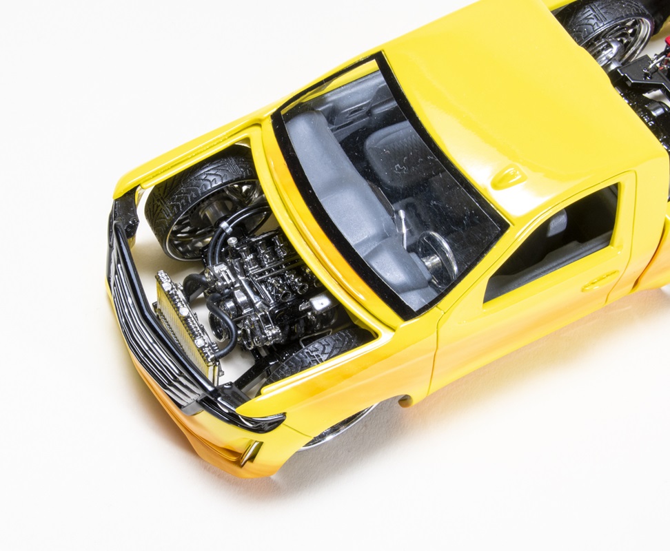 This is a JPS Customs 1/24 scale 2022 “Cadirado” built by Benjamin LeGrand. He opened the hood on the 3D-printed kit, added a fully detailed engine, supplied the chassis underneath with many machined aluminum parts, and improved the interior. The sunny finish is a custom color made with House of Kolor Shimrin2 lacquers. Benjamin then blanketed the paint job under 2K clear.
