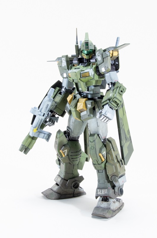 The Bandai MG Gundam Stormbringer F.A./GM Turbulence kit allows you to build either mobile suit out of the box, but Tom decided to take his favorite parts from each mech and create his own custom Gundam. He scribed panel lines and applied decals from another kit. Tom painted with Mr. Color, Splash, and Odenkan colors. Ammo, Vallejo, and Tamiya products added dirt, streaks, and pinwashes.