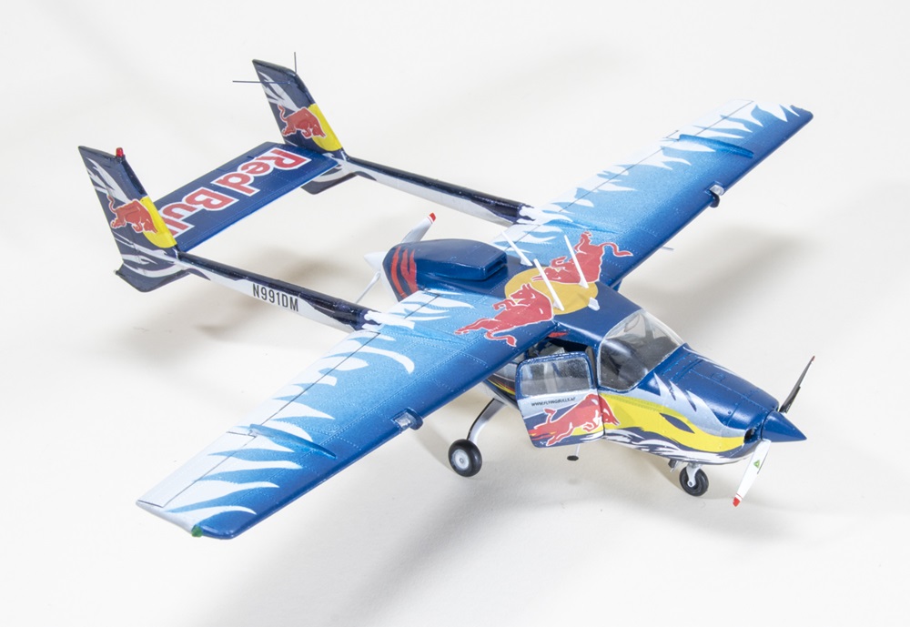 Kent thought the Red Bull O2-A Cessna Skymaster looked great and needed one for his model aircraft collection. To accomplish this, he turned to the venerable Testors 1/48 scale kit from the 1990s and proceeded to scratchbuild the interior floor, walls, ceiling, and control console. Individual sun visors and wing canards were added, as was a resin top for the engine. He wired the brakes, placed seat belts inside, and made custom decals. For paint, Kent went with Tamiya lacquers and acrylics. Gray washes weathered the control surfaces.