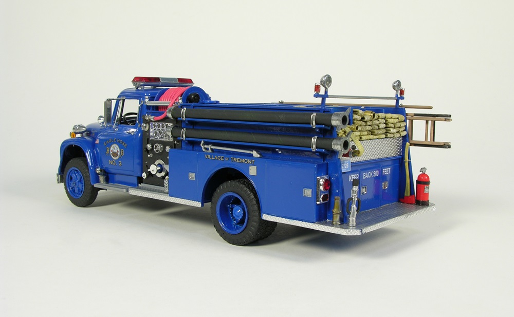 Charlie Rowley’s 1/25 scale 1970 International Loadstar Eagle Engine 3 has an AMT body and pump panel somewhere in there. The cab is an AITM resin addition, and he made the booster hose from electrical wire. Sewing elastic, painted with tan acrylics, replicates hose in the truck’s bed. Charlie designed his own decals and printed them on an ALPS printer. Final details were scrounged from his spares box.