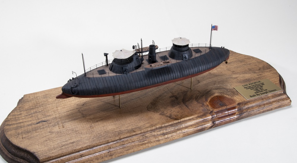 A Flagship Models 1/192 scale kit of the American Civil War ironclad USS Keokuk, 1863, underwent extensive modification to make it acceptable to Joe’s high standards. He turned masts from brass rods for the all-resin kit, turned the cannons from brass tubing, and made the awnings from white glue. Joe primed the model with automotive primer and airbrushed a variety of paints for the final appearance, including Vallejo, Testors Model Master, and Tamiya acrylics. The deck was brush-painted.