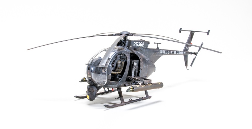 This spectacularly detailed Kitty Hawk 1/35 scale AH-6J Little Bird has Red Fox instrument panels; rocket pods, antennas, and cockpit details from Werner’s Wings; a FLIR ball from Cobra Company; and rockets from Black Ops Modeling. Earl’s model wears Tamiya NATO Black faded with a mix of the primary color and gray.