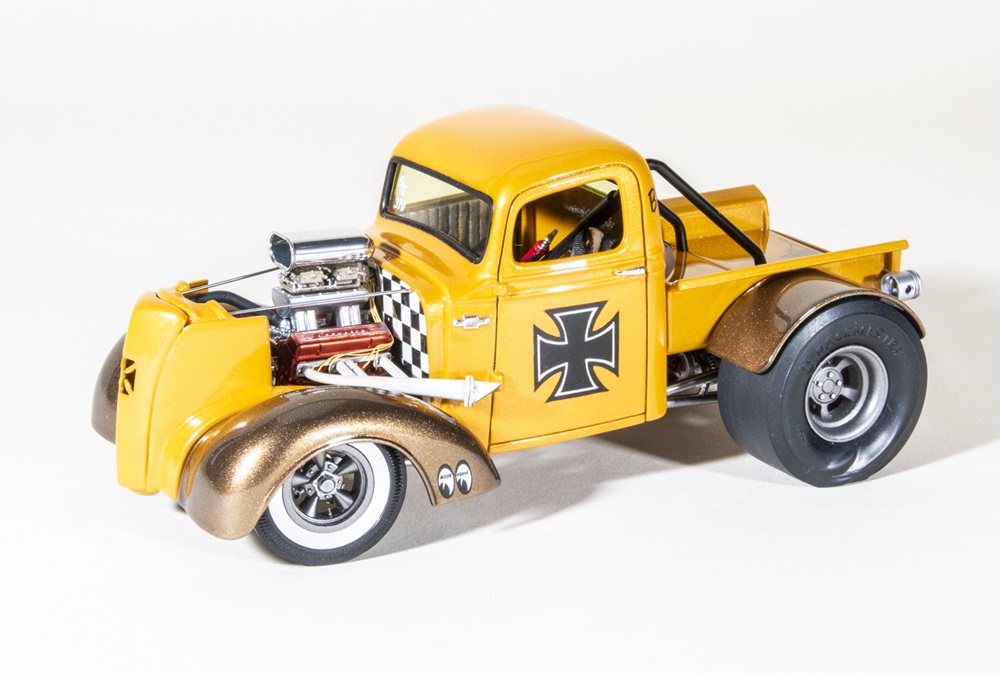 This ’37 Chevy pickup gasser replicates a classic Gas Class drag car without a high-nose stance. Built by Rick Doering with parts from the AMT/Ertl Orange Blossom Special, Revell Model T roadster, and Monogram Li’l Coffin kits, the combined results cannot be denied. All the paint was airbrushed over Mr. Surfacer primer, and Rick even painted the crosses on the doors.