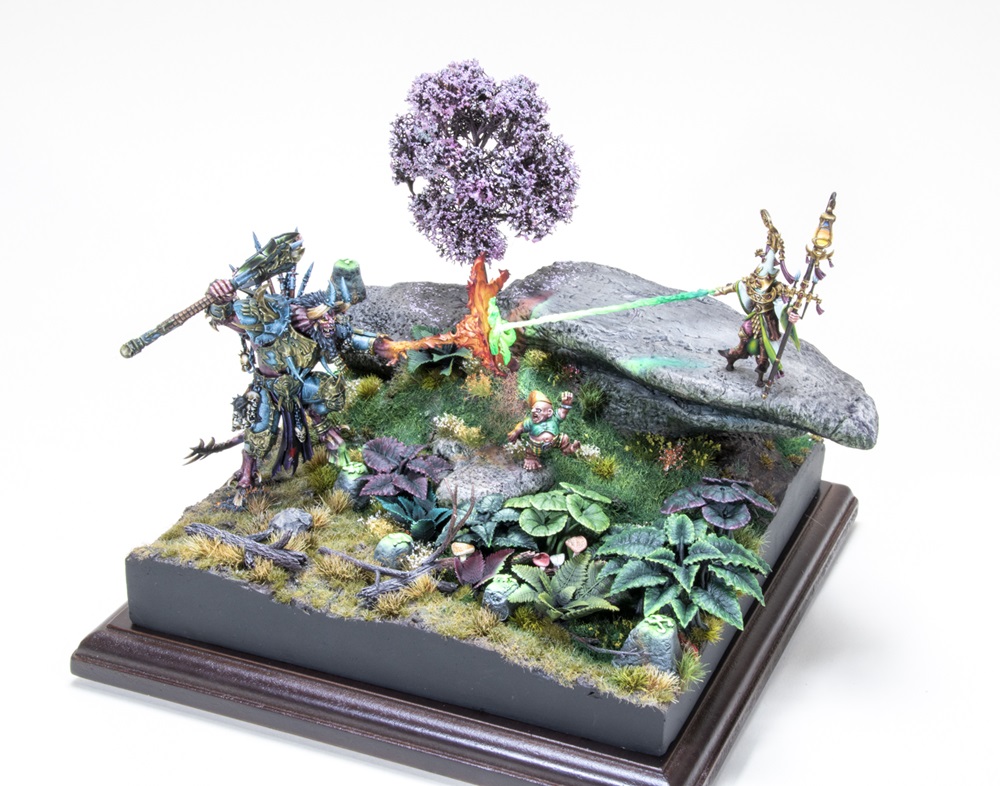 A base of clay, foam, flocking, and textured paste topped with 28mm figures from Games Workshop create Nicholas’ scene of a demon prince chasing a halfling who is protected by an elf wizard. He sculpted the magic effects from acrylic modeling paste, and the plants were 3D-printed. The scene’s vibrant colors were achieved with Vallejo and Pro Acryl acrylics.