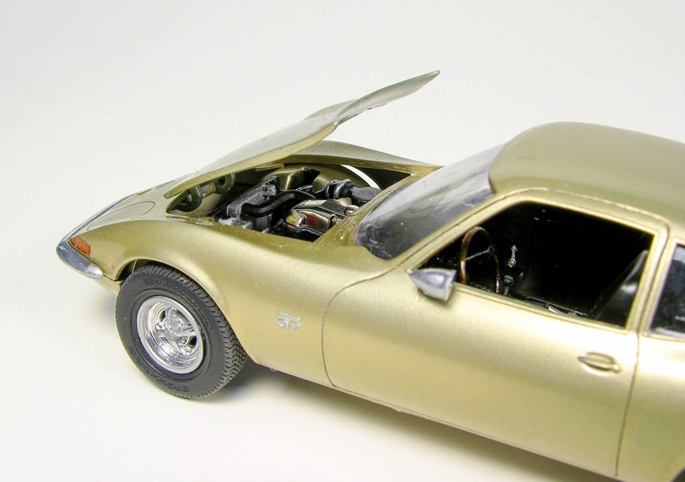 Tamiya Titanium Gold graces Jim Parker’s AMT 1/25 scale Buick Opel GT, built for a group build hosted by Grandpa Mark’s Hobbies on YouTube. The theme for the build was movies and TV. The Opel’s custom license plate says, “Get Smart,” referencing the 1960s TV series.