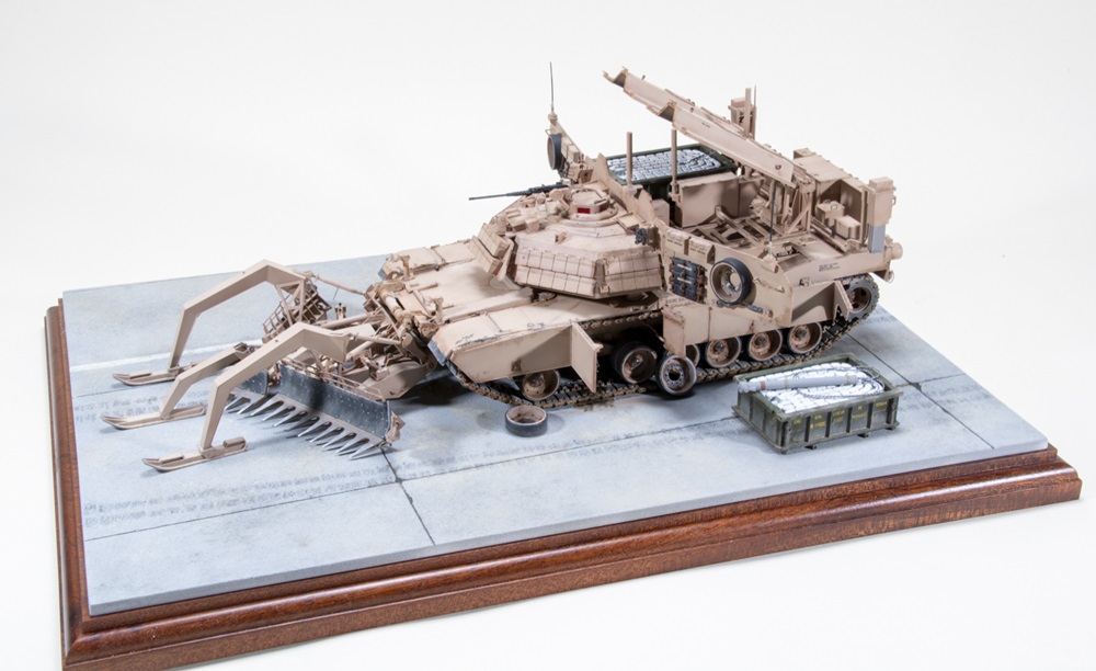 Phil took several photos of a real M1 ABV (Assault Breacher Vehicle) that he utilized when building a Rye Field Models 1/35 scale kit. He rounded out details with styrene and copper wire before painting the AFV with enamels and lacquers from various brands. Artist oils handled the weathering while pigments simulated desert use. A walnut base supports the ABV with 1/4-inch styrene sheet finished as a highly trafficked work area.