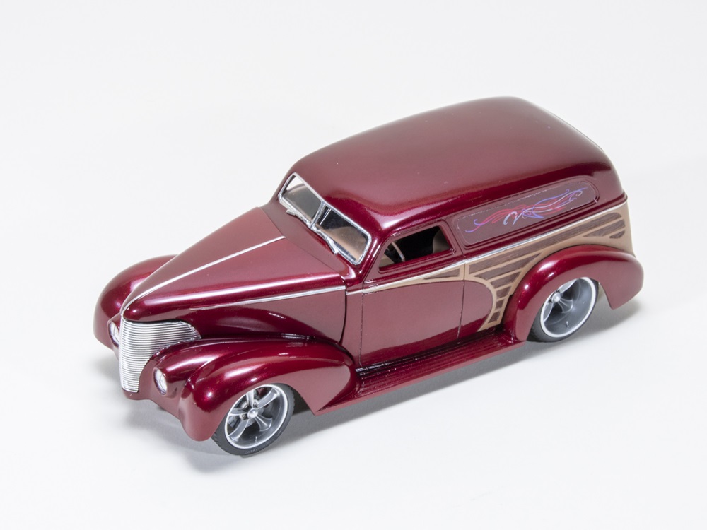 Steve arrived with his sleek AMT/Ertl 1/25 scale ‘39 Chevy wagon hot rod. He added spark plug wires, throttle cables, and injector lines to the engine and set the car riding on 3D-printed wheels. MCW Velvet Red Metallic and hand-painted and masked wood finished it off.