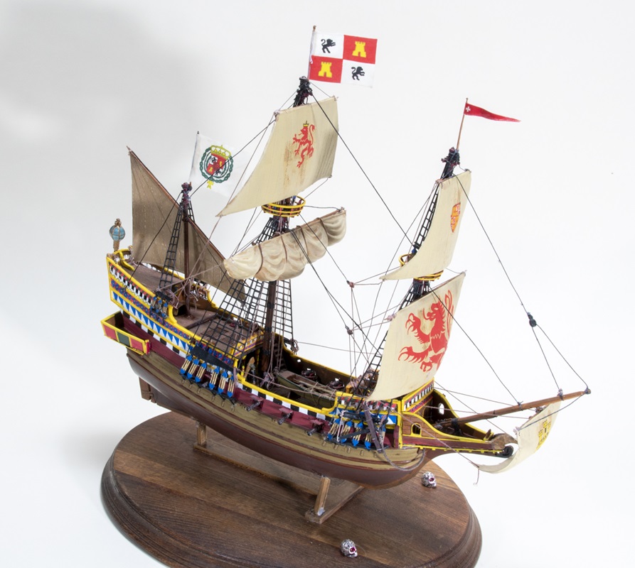 To model his 1/72 scale Spanish galleon, Gary turned first to a Revell Ghost Ship and then equipped it with guns on the weather deck and a main sail from an Airfix HMS Prince. He rescued the flags and decals from his spares. The colorful trim comes from a combination of paint brands, including Tamiya and Model Master, wood stains, and paint pens. Gary said he found the base at a thrift store and he replaced the handle with a pair of skulls.
