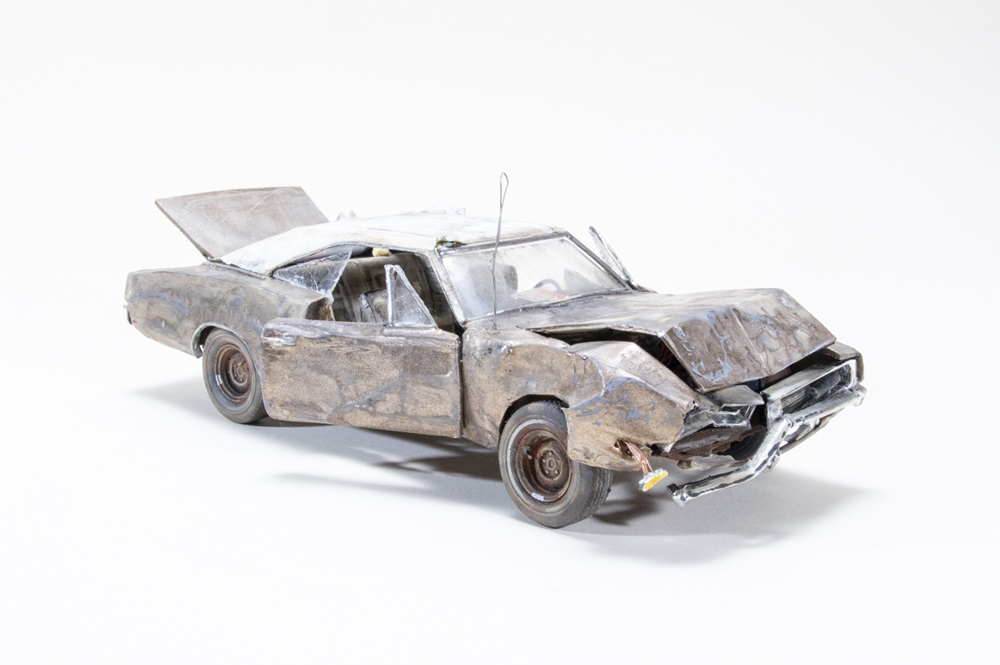 If you’re familiar with Troy’s work, you’ll know him from his fantastically damaged and beat-up cars, and this MPC 1/25 scale 1969 Dodge Charger is a new addition to his collection. He crafted damaged body panels from tin foil, a vinyl top from automotive masking tape, used a cellphone screen protector for the broken glass, and a bread twist tie for a radio antenna. Troy wet-sanded the red oxide and gray primed Rust-Oleum Gold car to give it that junker look.