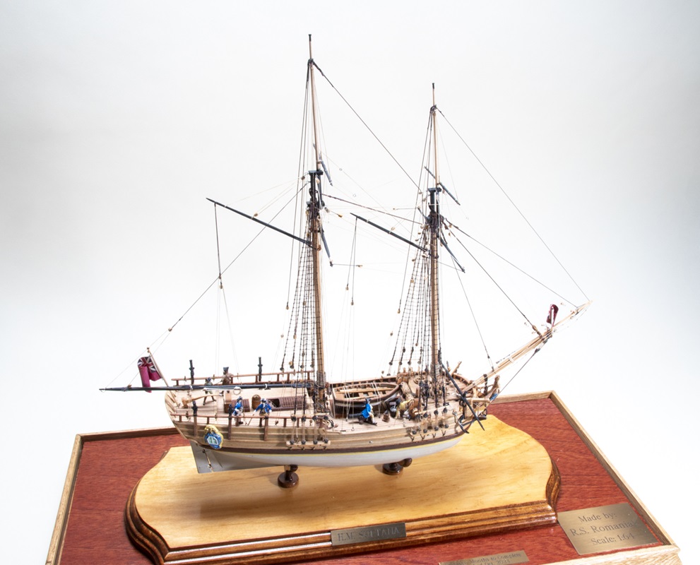 HMS Sultana has the distinction of being the smallest schooner to ever be entered into the Royal Navy’s lists, and had a remarkably brief career (1768-1773) serving mostly off the North American coast before being sold at auction. Richard scratchbuilt his 1/64 scale wooden ship model. Any paint he used was acrylic and applied with a brush and a mixture of masks and freehand.