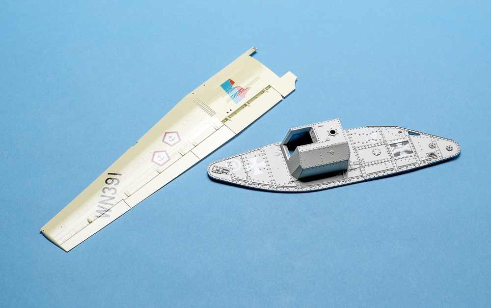 A coat of clear gloss allows paint to run freely, enhancing the capillary action that draws the wash into recesses and details. On the left is a 1/72 scale C-160 Transall wing painted with enamels; on the right, a hull side from an Emhar Mk.V tank painted with gray acrylics.