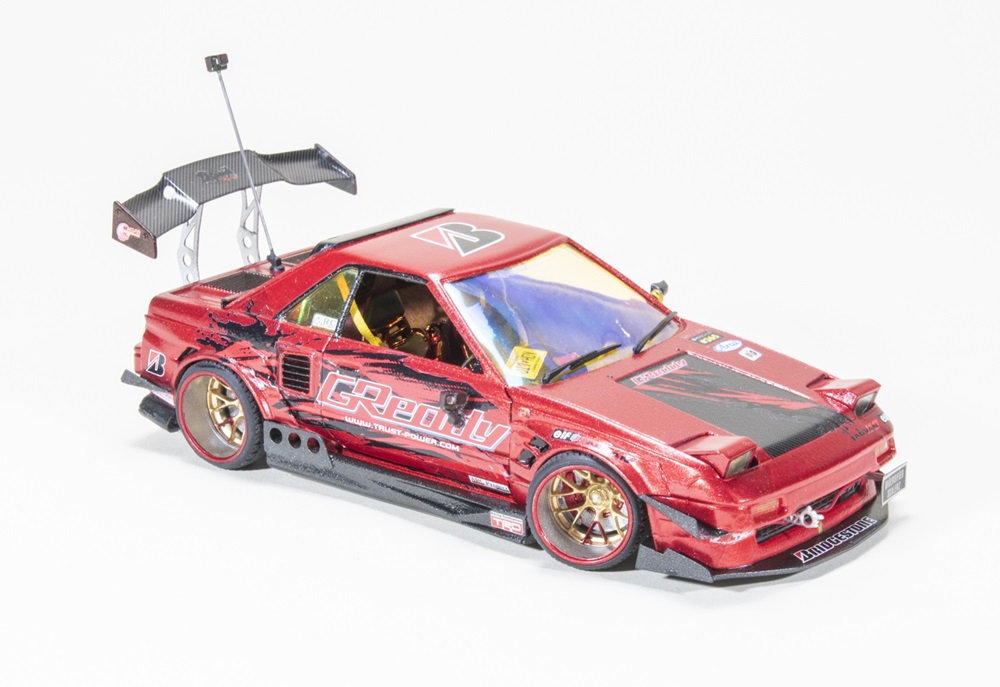 You may not be able to see it under the Voltex Racing body mods, but there is a Fujimi 1/24 scale 1986 Toyota MR2 Supercharger down in there. Steven Johnson added the aftermarket modifications and cut down and moved the Toyota’s back window. He painted his blacktop beauty Tamiya Metallic Red, and even placed scale-sized GoPros on the door and rear wing to capture all the high-speed action.