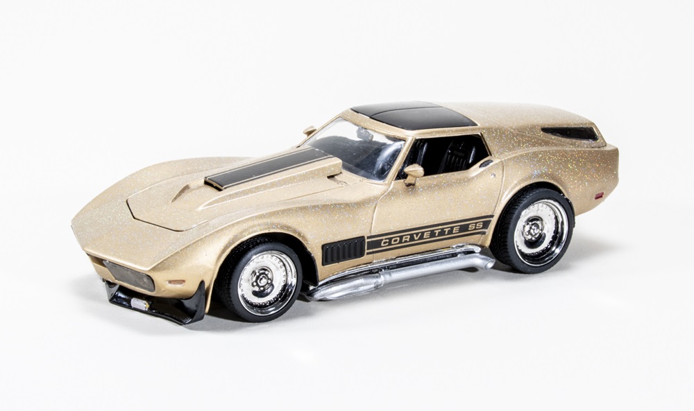 Deb bought two Monogram 1/24 scale Corvette SS hatchback kits for $5 at a flea market to build one complete model. Built box stock except for the Pegasus wheels (the kit wheels were missing from both kits), the unique ’Vette wears Tamiya Gold with Model Master Multi-color Glitter Clear. Tamiya Smoke tints the T-tops and back windows.